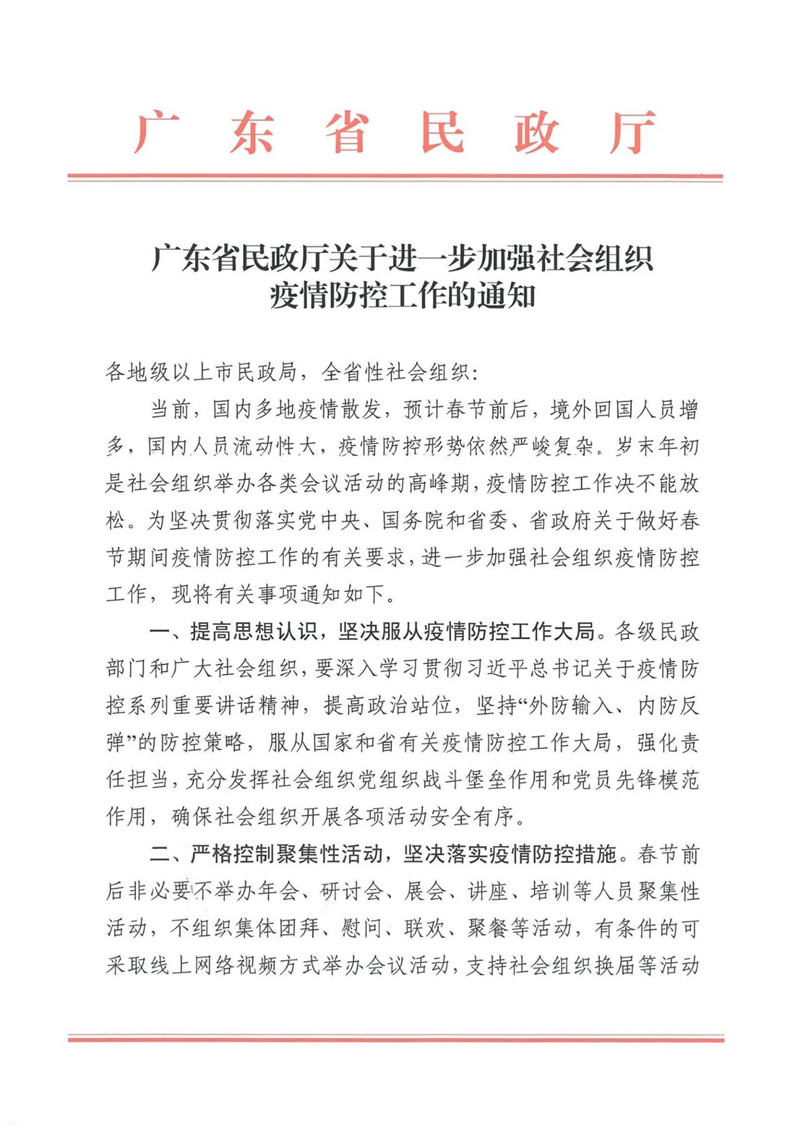 广东省民政厅关于进一步加强社会组织疫情防控工作的通知
