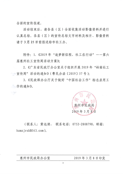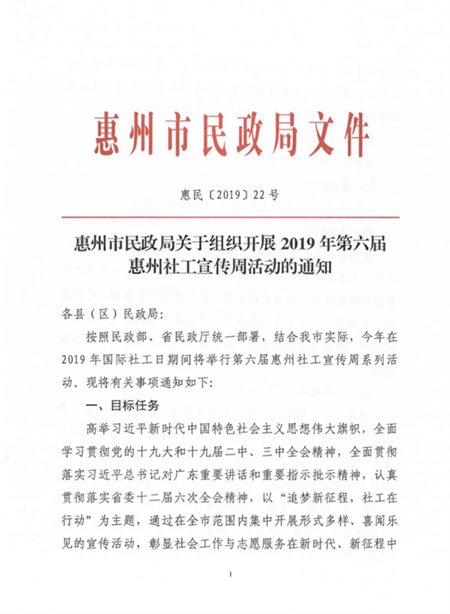 惠州市民政局关于组织开展2019年第六届惠州社工宣传周活动的通知