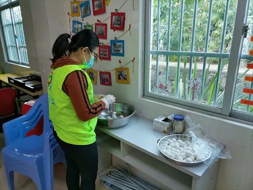 社工先将糯米粉再加入开水揉成团,干湿要掌握好,放进锅里将糯米粉蒸熟,使劲揉。接着再将糯米粉压成圆饼状包入各种陷料,有芝麻馅的,有花生馅的,还有红豆馅,一个个圆溜溜的汤圆就制作完成了。在水待开的时候加入糖粉,这样的汤圆就可以干湿两吃。最简单的食材,做出的不一样的吃法。最后社工们将做好的汤圆和糖水搬到新寮文化广场派发。此次活动得到了村民的一致好评。大家开心地吃着汤圆,说着各自家乡的冬至习俗,感受着冬至暖暖的爱意。