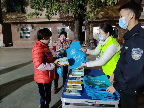 这群广场舞“大妈”是下一村健康舞蹈队舞蹈队的队员。她们在文化中心排练舞蹈前,看到社工与联防队在宣传禁毒知识,便主动当起了禁毒宣传志愿者。她们拿上印有禁毒知识的宣传单、布袋及纸巾走到村民身边,向休闲玩耍的村民、外来务工人员、路过的中小学生等人群发放宣传资料,并热情地讲解吸毒的危害和青少年如何拒绝毒品及法律如何惩处毒品违法犯罪行为等知识。